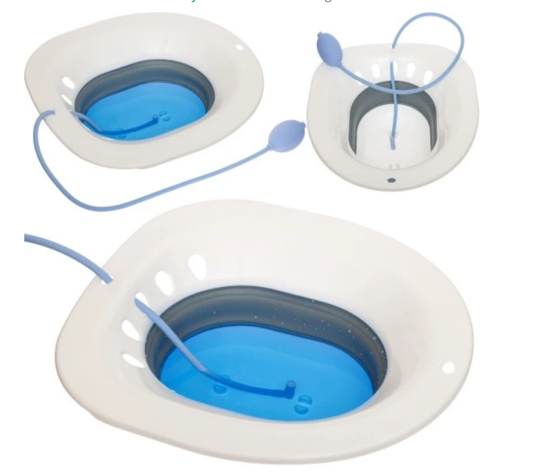 Összecsukható bidé-ülőkád, öblítőpumpával, amely segít tisztán és frissen tartani az intim területeket. Fehér színű, színes állítható betéttel, hordozható - guggolás nélküli - higiéniai ülőkád, mindennapi használatra. Különösen ajánlott időseknek, szülés előtti és szülés utáni ápoláshoz, műtét után, mozgáskorlátozottaknak. Az eszköz vízöblítéses WC-re, közvetlen a kerámiára helyezve használható.